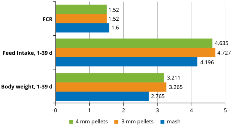 Trong một thử nghiệm trên gà broiler, khẩu phần với viên 3mm và 4mm cho kết quả vượt trội so với thức ăn dạng bột, với lượng ăn vào, tăng trọng và FCR đều cải thiện rõ rệt (Hình 1).